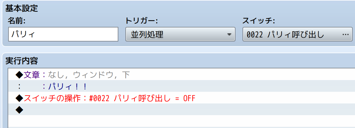 このスイッチをトリガーとした並列処理のコモンイベントを用意することで、自由にジャストアクションを設定できます。