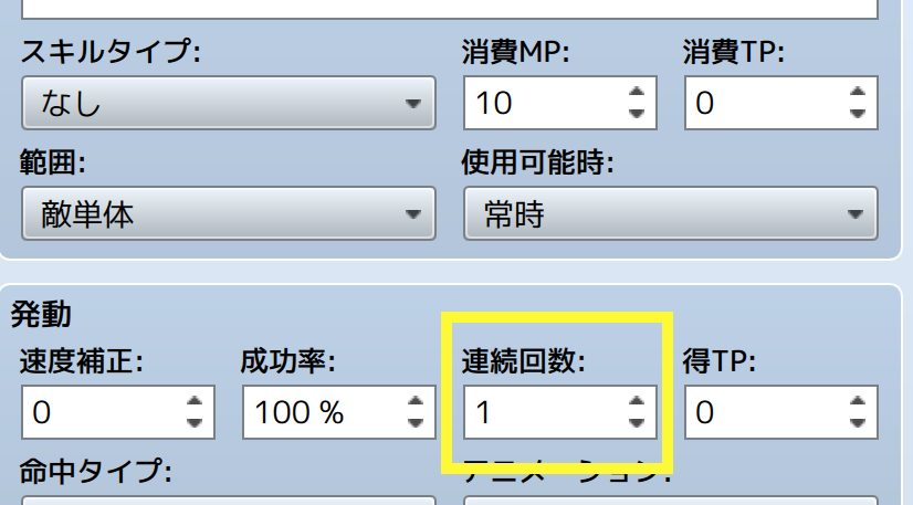 データベースのスキルにおける「連続回数」で「1」を設定すれば単発ヒットになり、1度当たった判定の被弾対象から外れます。