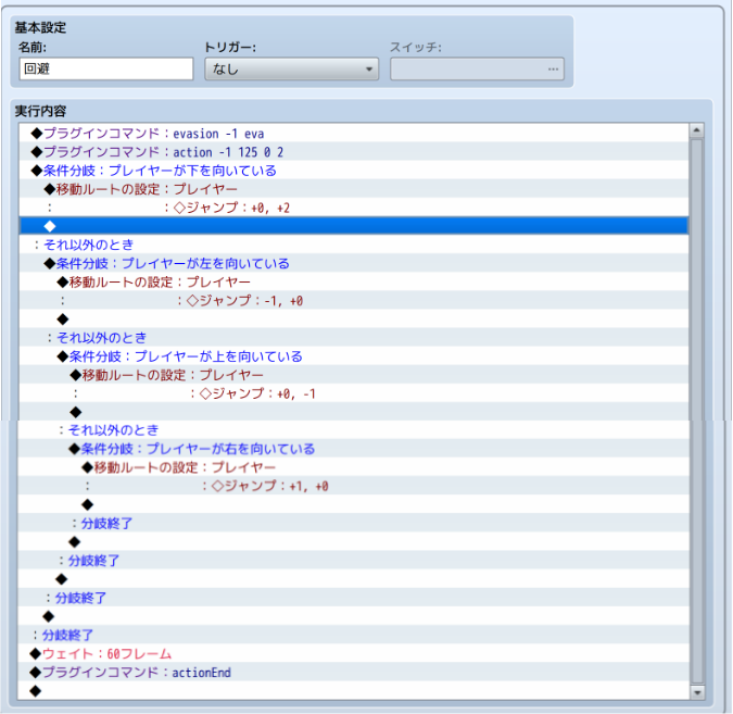 呼び出したコモンイベントから追加のactionを実行させることで、たとえばパリィステートを付与させて高ダメージの追撃を狙えたり、ジャスト回避を決めた際の恩恵を設定することが可能です。