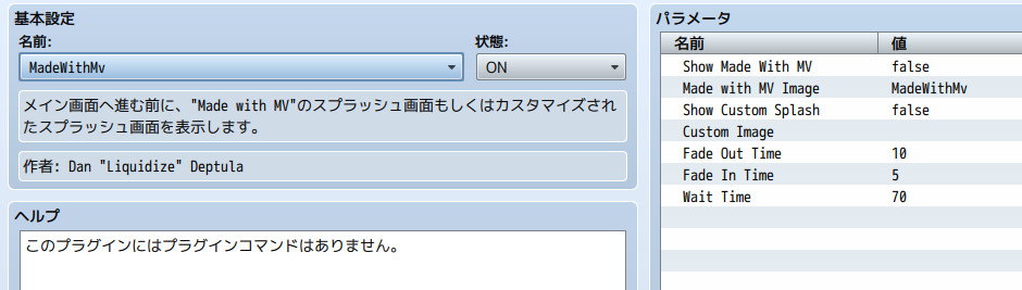 右図では一番上のパラメーターshow Made With MVがfalseとなっているため、これを「true」にして有効化してください。