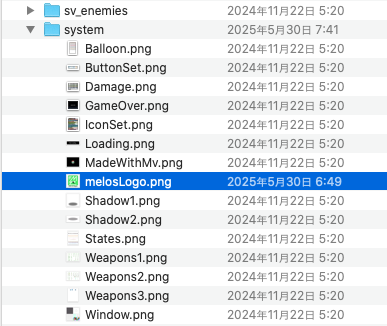 表示に際し、添付されている「melosLogo.png」ファイルを、img > systemに移動して下さい。