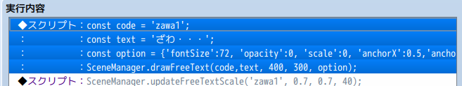 設定する場合、{"fontSize": a, "opacity": b, "scaleX": c, "scaleY": d, "anchorX": e, "anchorY": f, "skewX": g, "skewY": h, "rotation": i, "color": j, "outlineColor": k}を、 option の部分に記入します。