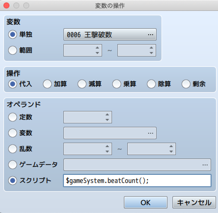 - 討伐回数の取得 : $gameSystem.beatCount();