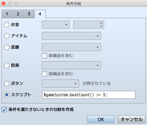 イベントコマンド「条件分岐」の「スクリプト」で次のように記述します。