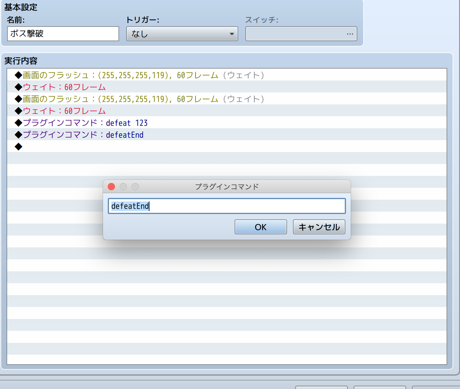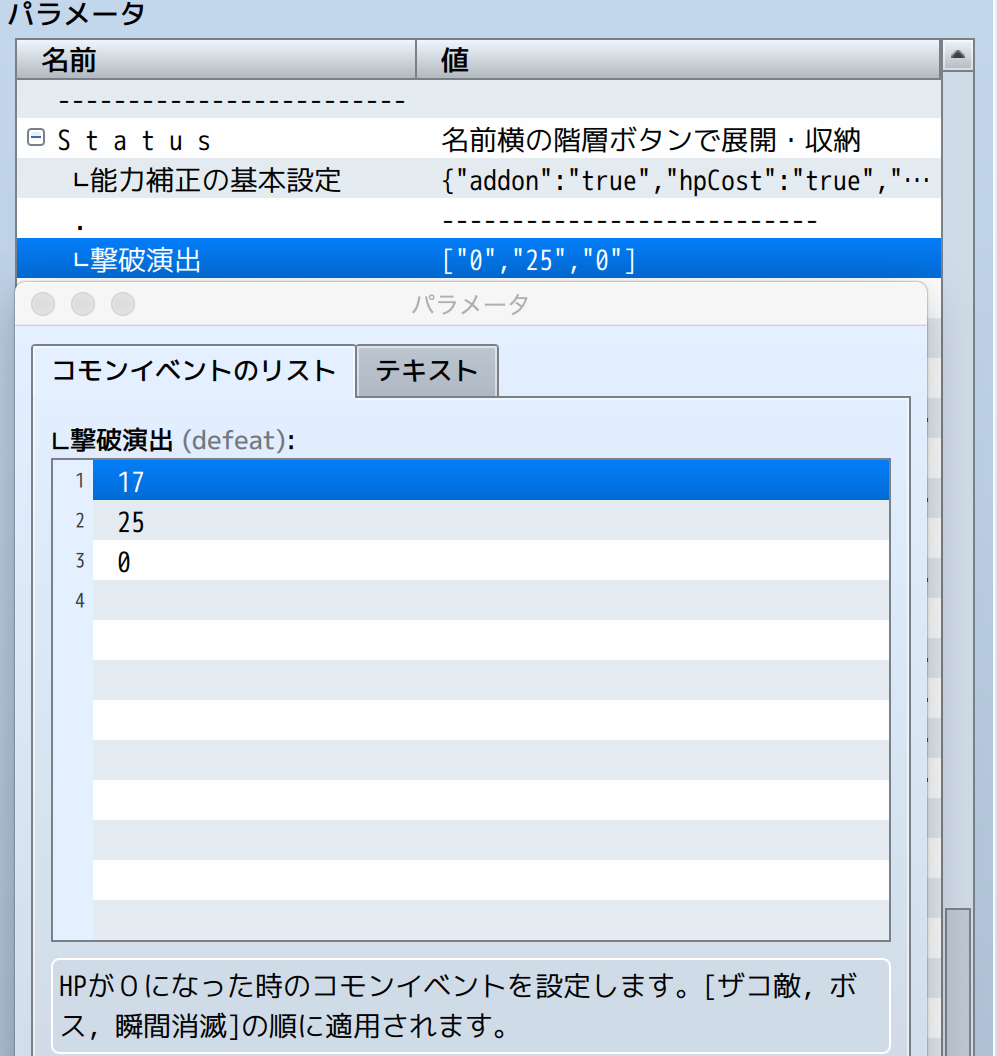 敵を倒した際に追加で実行する演出を、コモンイベントとして設定します。