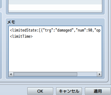 記述例) <limitedState:[{"trg":"hp","num":85,"opt":true}, {"trg":"state","num":10,"opt":false}]>