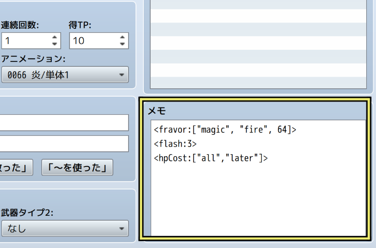 データベースやマップイベントの「メモ欄」に追記できる、<>で囲まれたタグです。